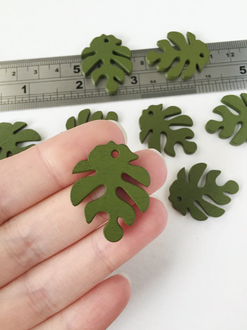 10 x Olive Green Wood Monstera Leaf Pendants, 30x25mm