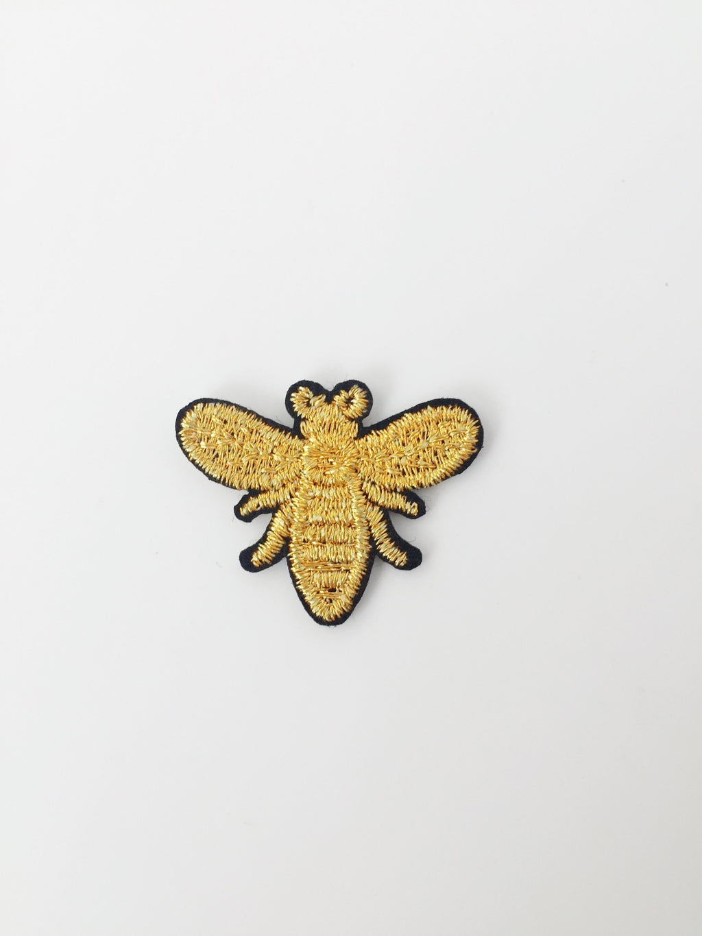 Gold embroidered bee iron-on patch, available in 3 sizes