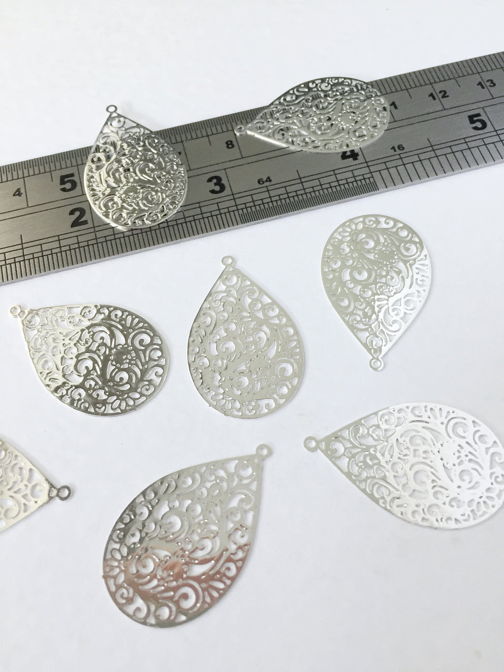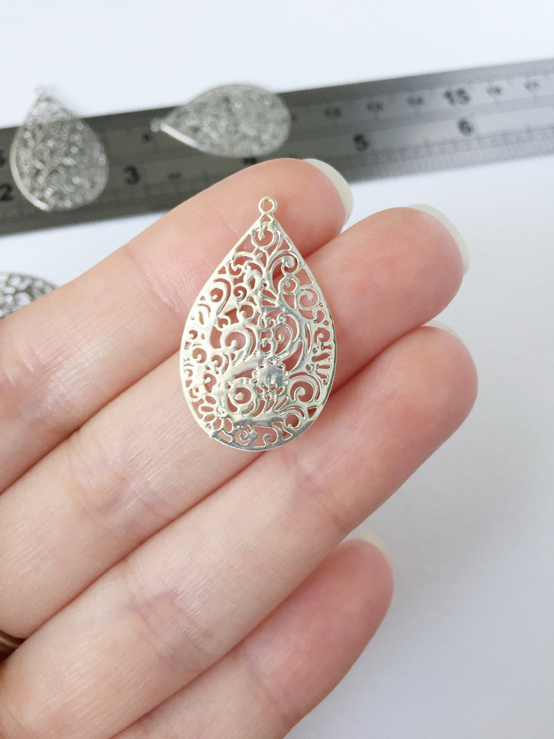 2 x Silver Plated Filigree Drop Pendants, 30x19mm (0466)