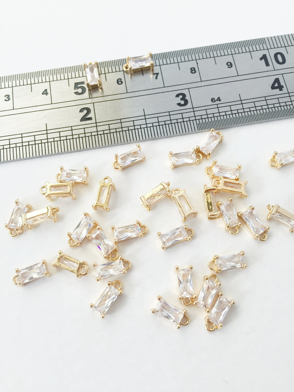 2 x Tiny Crystal Clear Baguette Cut Glass Pendants in Gold, 4x8mm (1007)