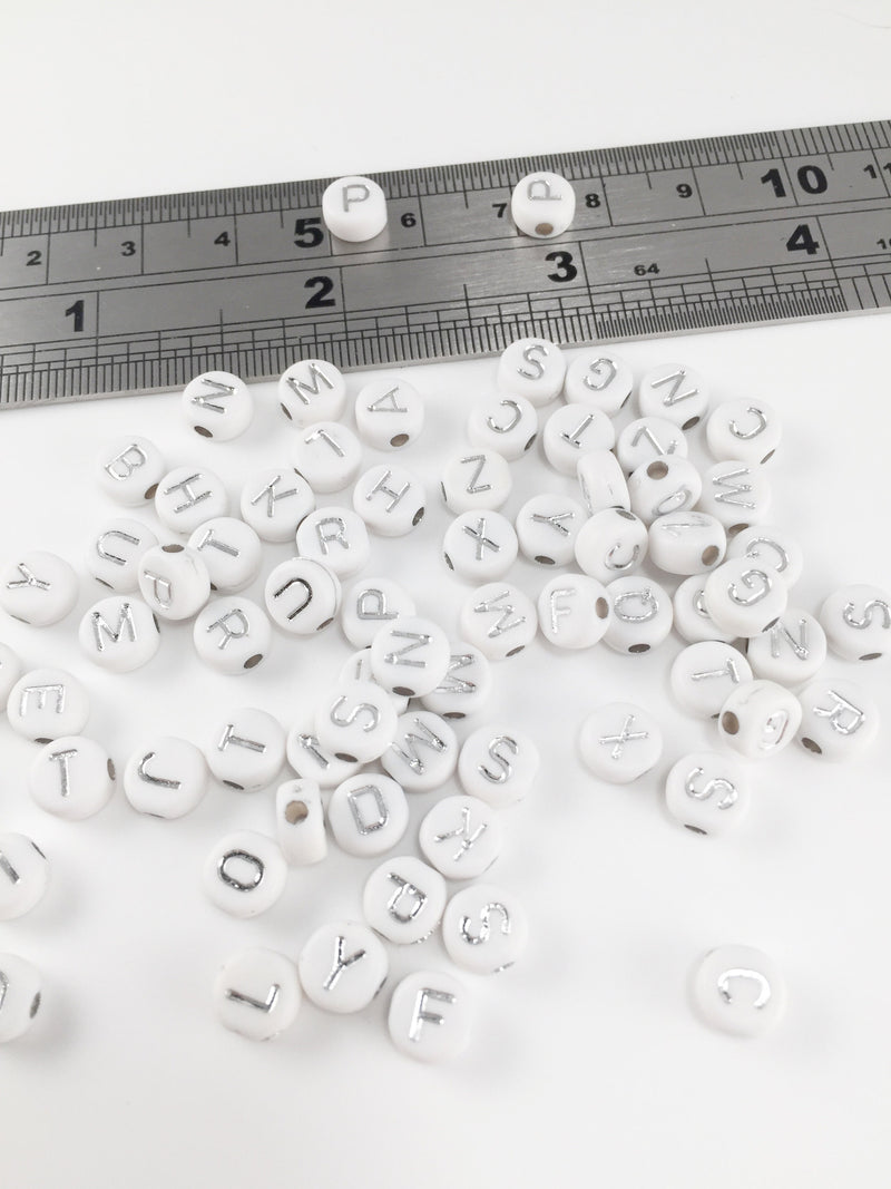 100 x White and Silver Alphabet Beads, 7mm Acrylic Letter Spacer Beads (1871)