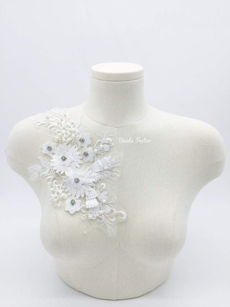 Off-white embroidery lace applique with 3D flowers, embellished with faux pearl and rhinestones