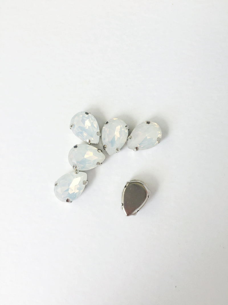 White Opal Glass Teardrop Rhinestones in Silver Tone Sew-on Setting, Different Sizes