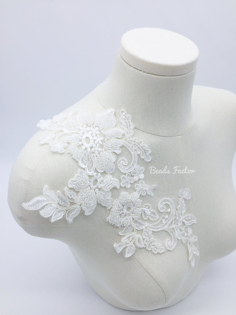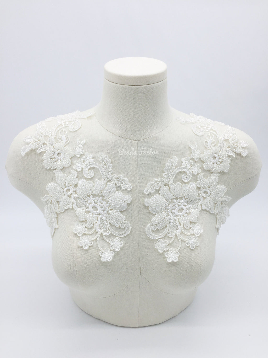 1 pair x Luxury Beaded Ivory Floral Lace Applique, 30x15cm