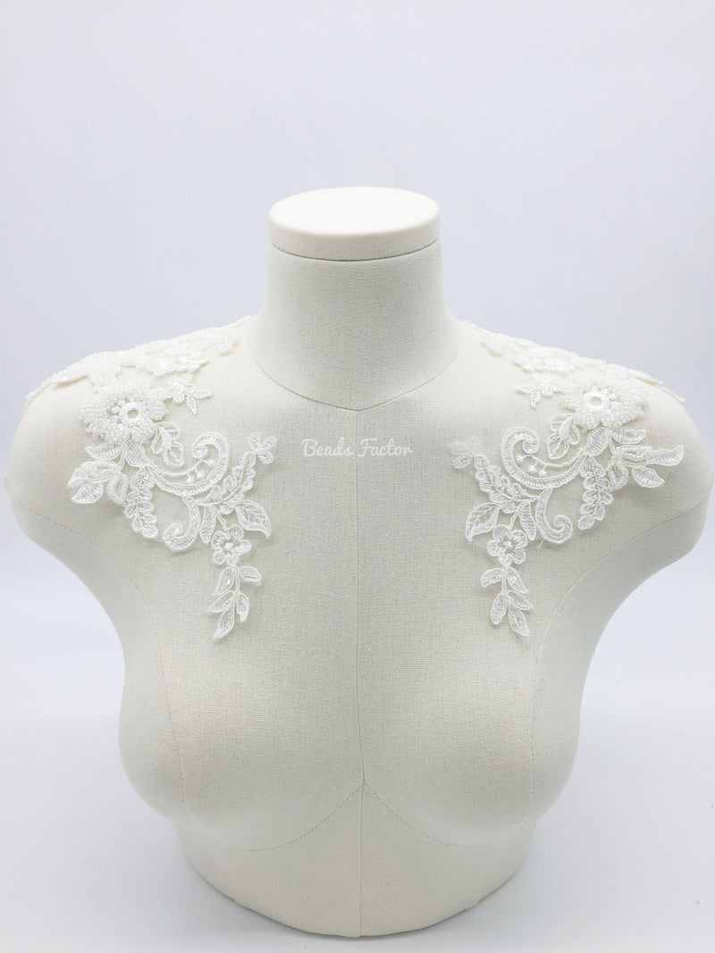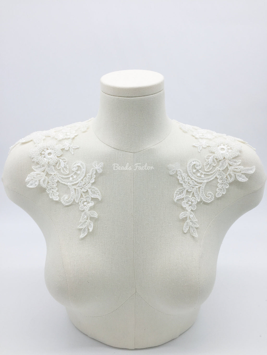 Ivory lace applique beaded with pearlised seed beads and sequins, mirrored pair, suitable for wedding dress straps etc.