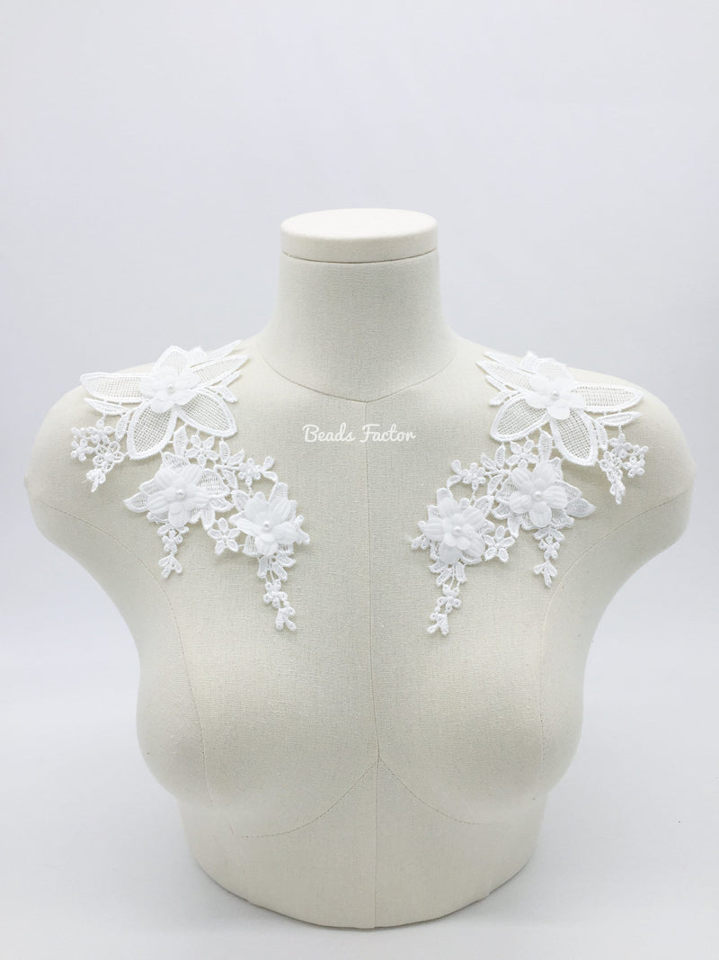 White embroidery lace applique with 3D flowers, embellished with faux pearls, mirrored pair