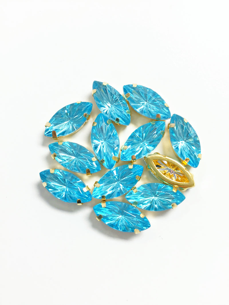 ✨ Sky blue resin marquise cut rhinestones in gold tone sew-on setting.