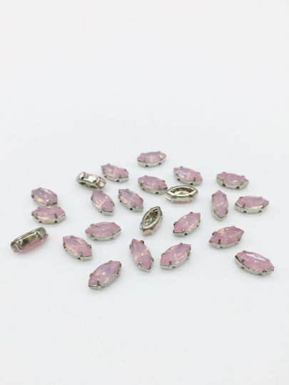 24 x 5x10mm Marquise Cut Pink Opal Rhinestones in Silver Tone Sew-on Setting (3855)