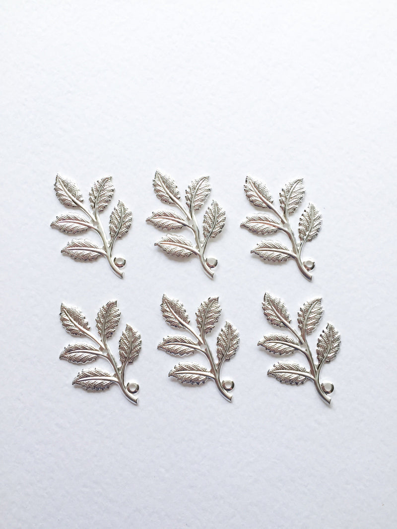 6 x Bright Silver Rose Leaf Branch Pendants, 50x30mm (D6)