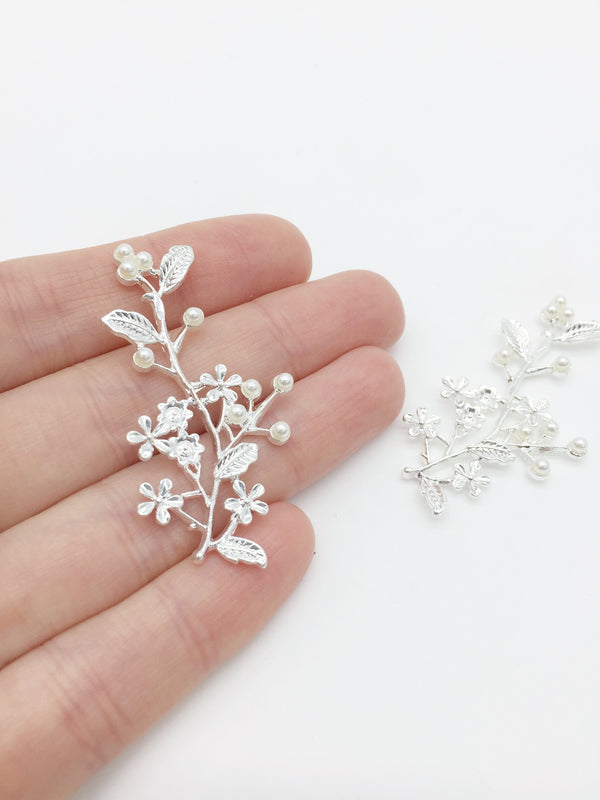 2 x Silver Plated Flower Branch Leaf Charms with Pearls, 50x24mm (3514)