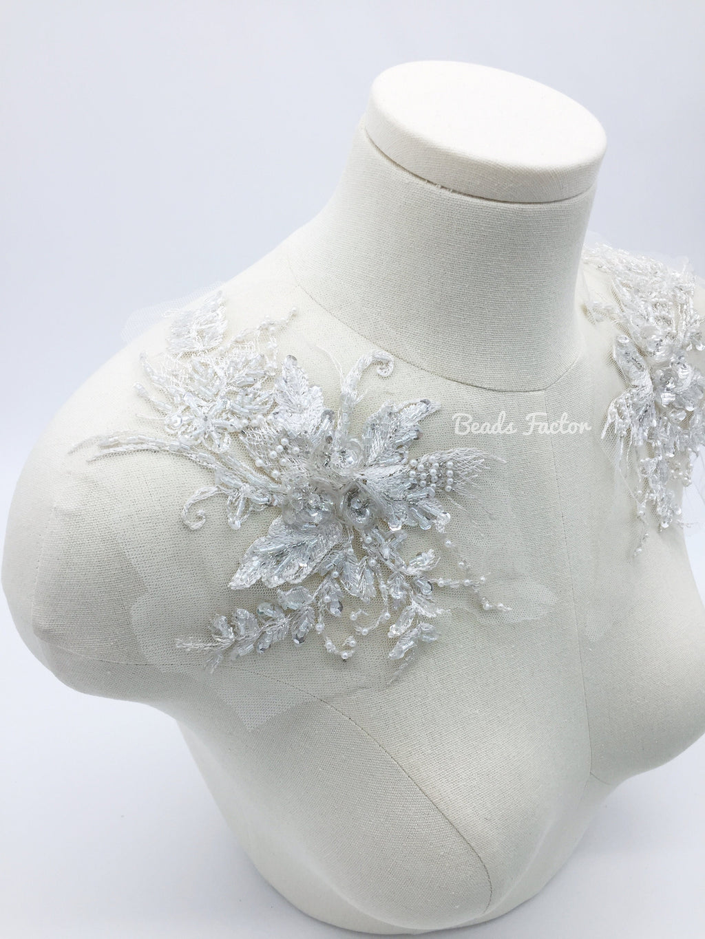 White embroidery lace applique beaded with pearls, seed beads, sequins and crystals, mirrored pair