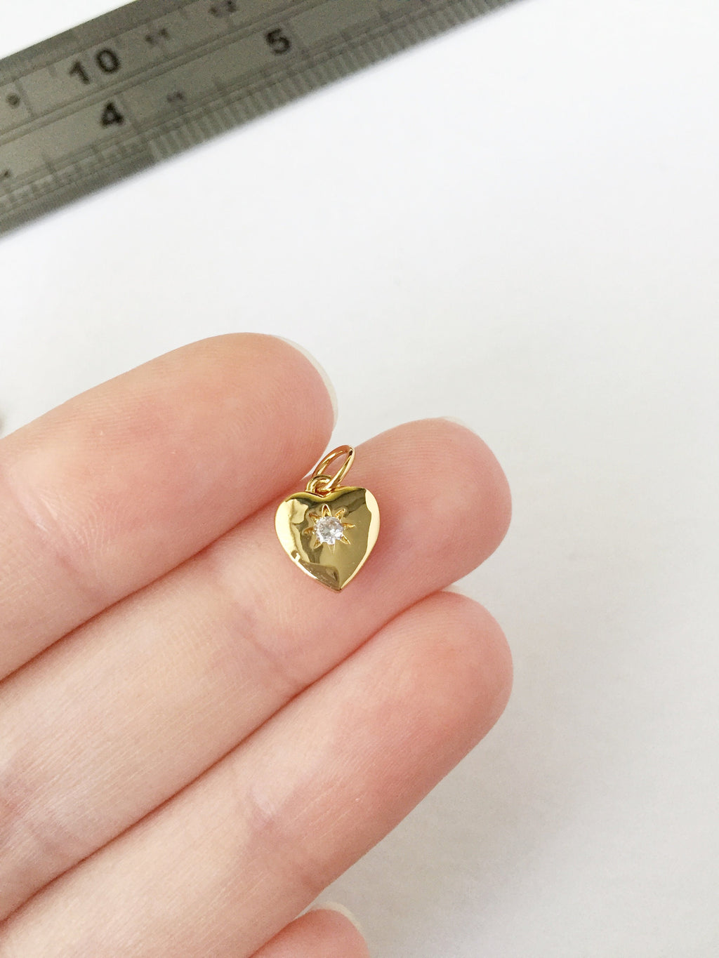 ✨ Gold plated heart brass charms with cubic zirconia center in a shape of a star, supplied with a jump ring