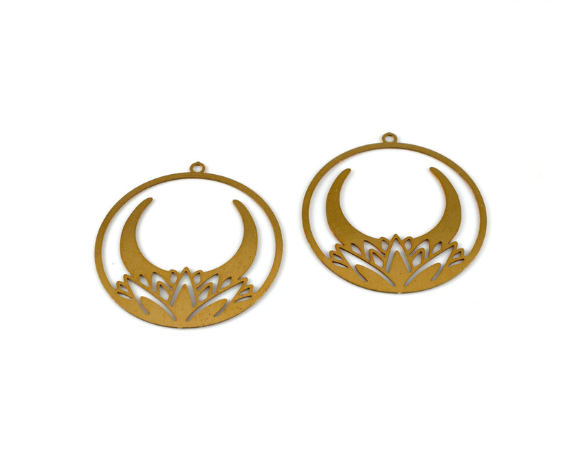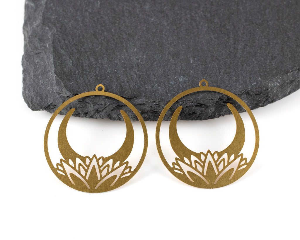 2 x Raw Brass Lotus Moon Filigree Pendants, 32x30mm (C0471)