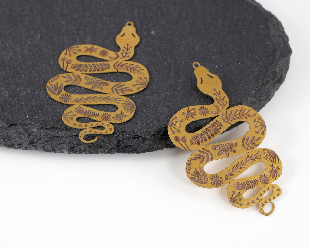 2 x Laser Cut Raw Brass Snake Pendants, 51x29mm (C0456)