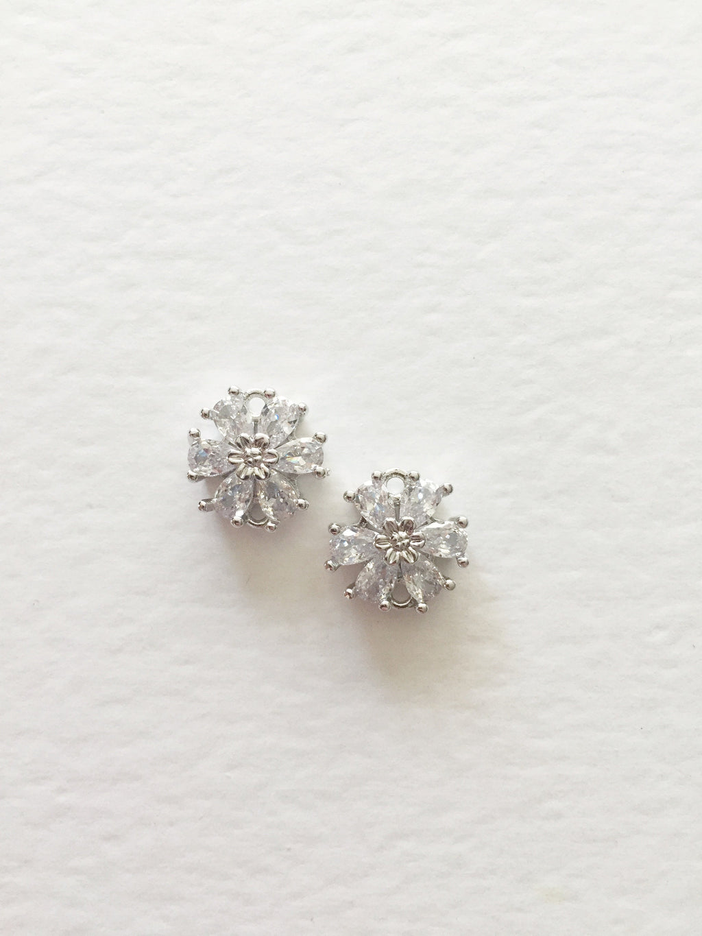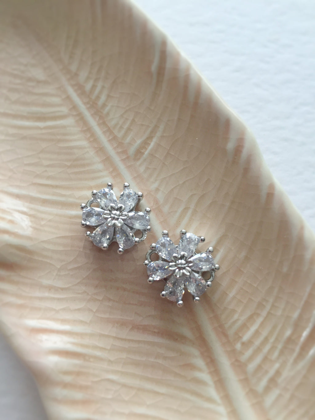 ✨ Cubic zirconia flower connector in white gold plated brass setting, has 2 loops