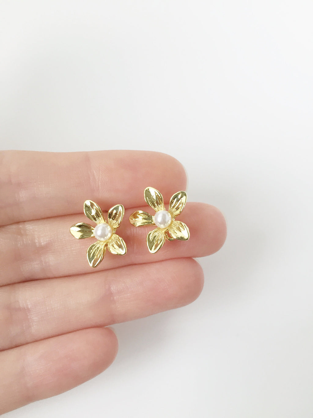 ✨ Flower earring studs with pearl centre, with a loop at the back, made of gold plated alloy and faux pearls with 925 silver plated posts