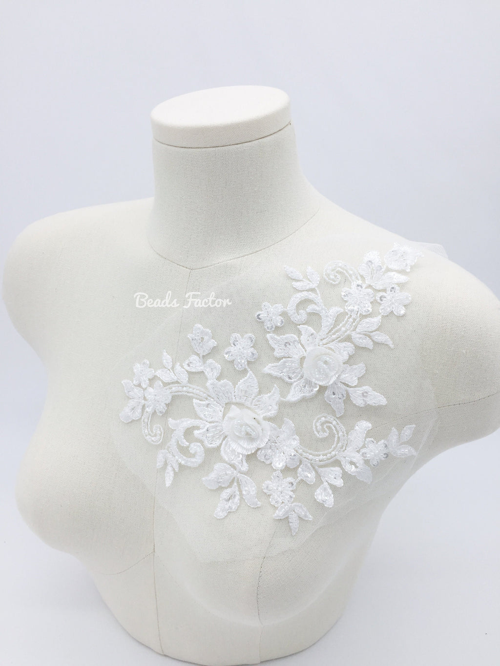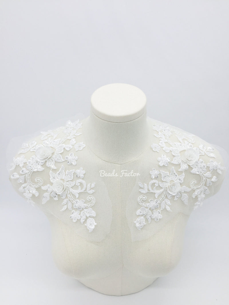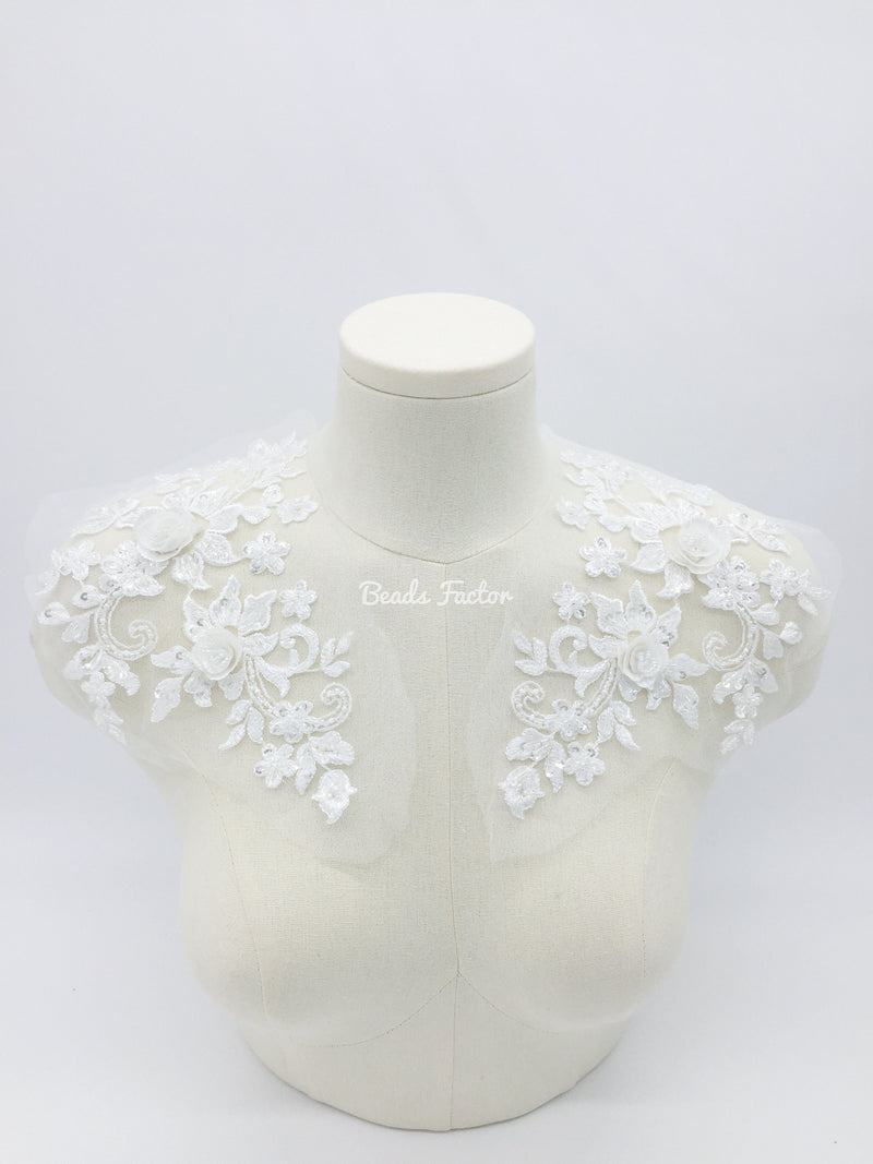 Off-white lace applique beaded with sequins and seed beads, with 3D flowers