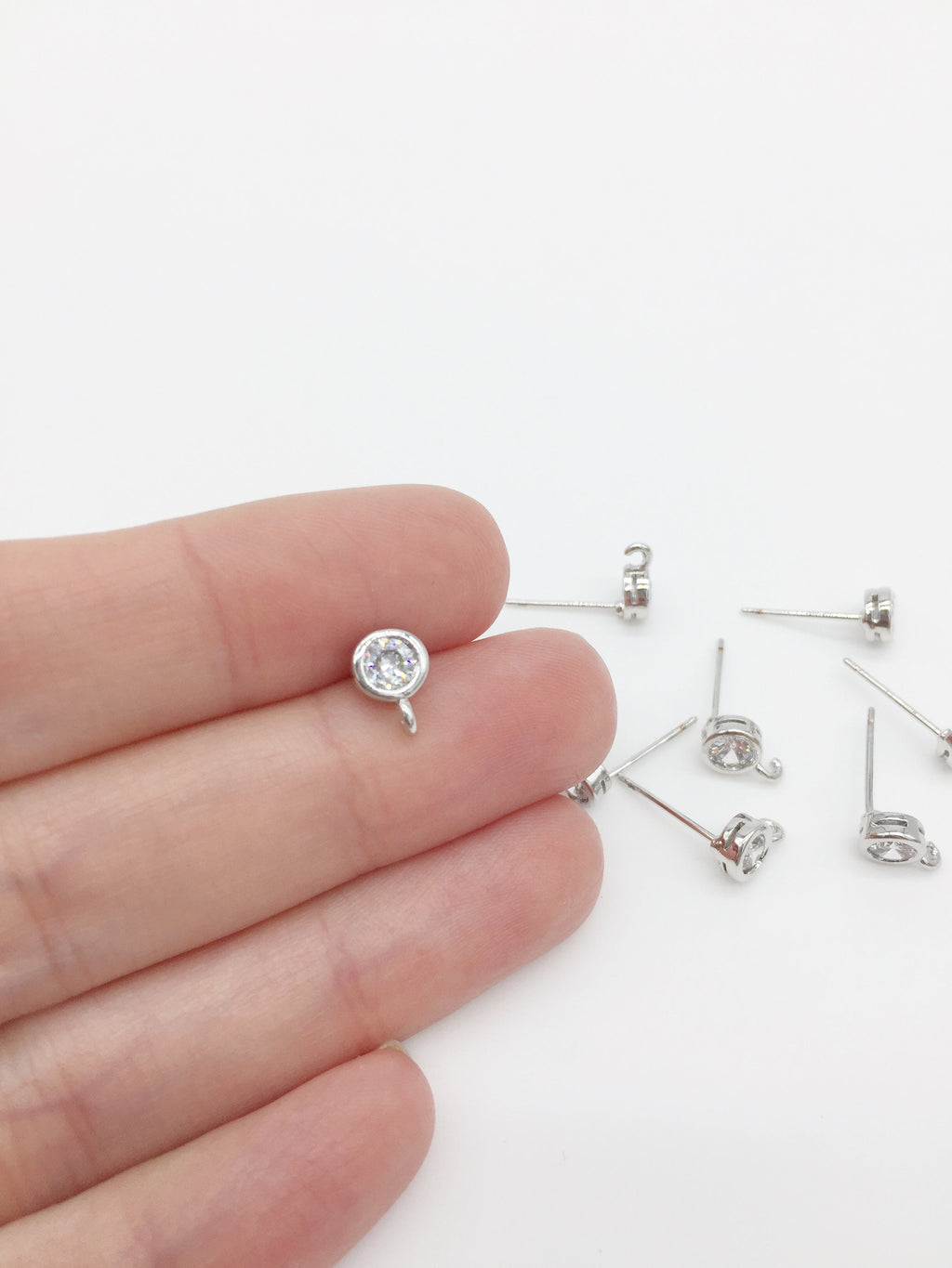 ✨ Platinum plated brass earring studs, with bezel set cubic zirconia, supplied with silicone earring backs