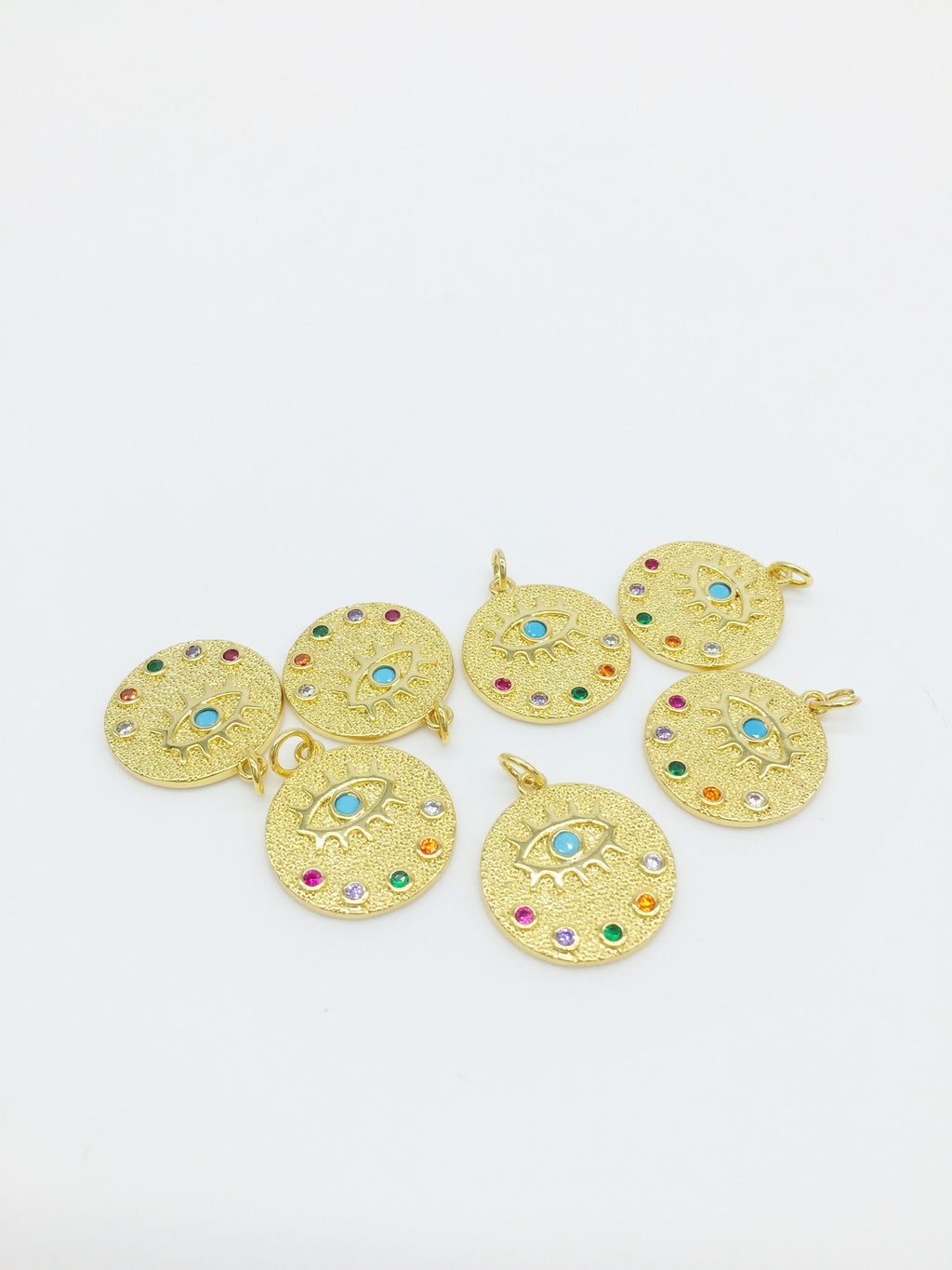 ✨ 18K gold plated textured round charm with evil eye detail, encrusted with multicolour cubic zirconia, supplied with a jump ring