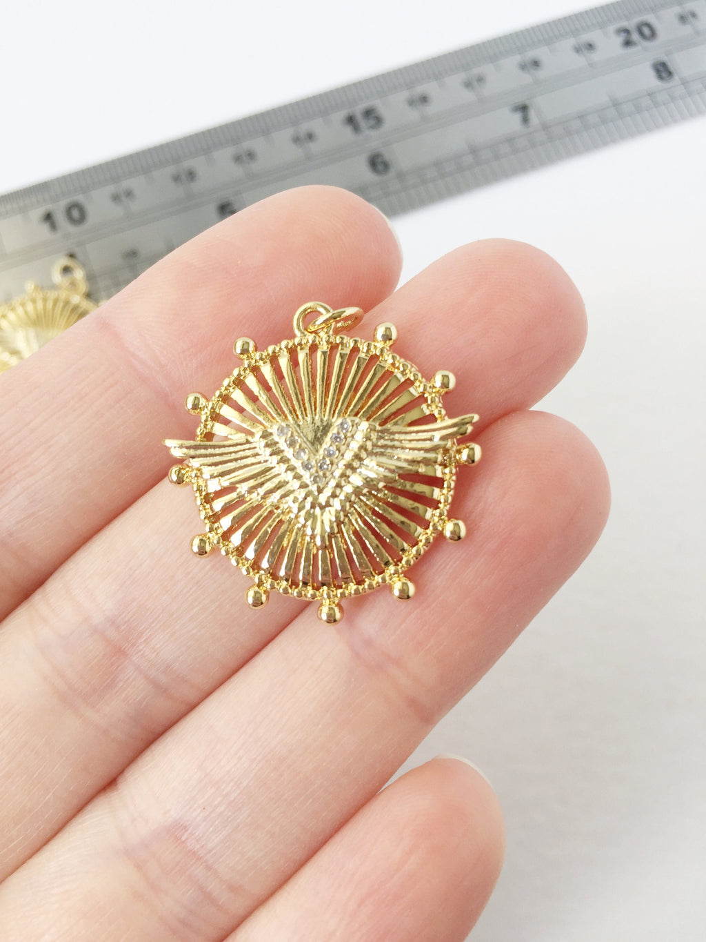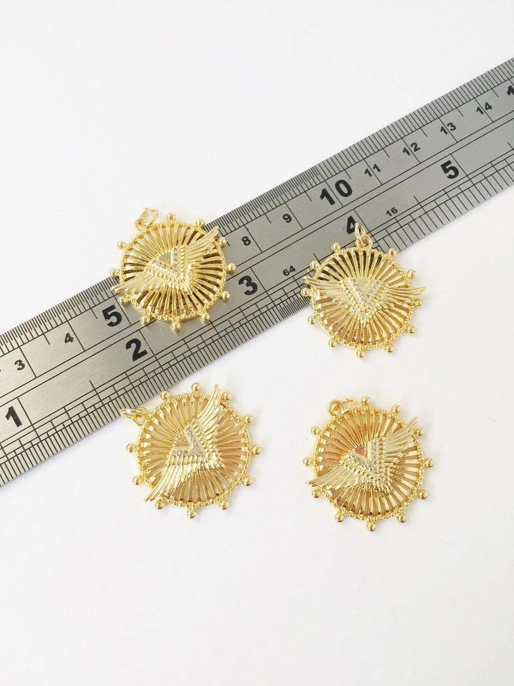 1 x 18K Gold Plated Round Wings Pendant with Cubic Zirconia, 26x25mm (1075)
