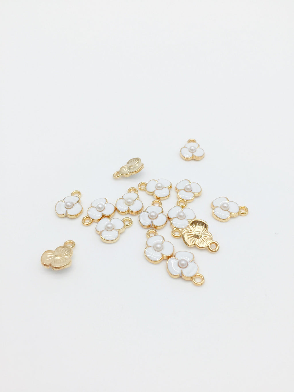 ✨ Tiny three petal flower charms, white enamel coating on gold plated alloy with faux pearl centre