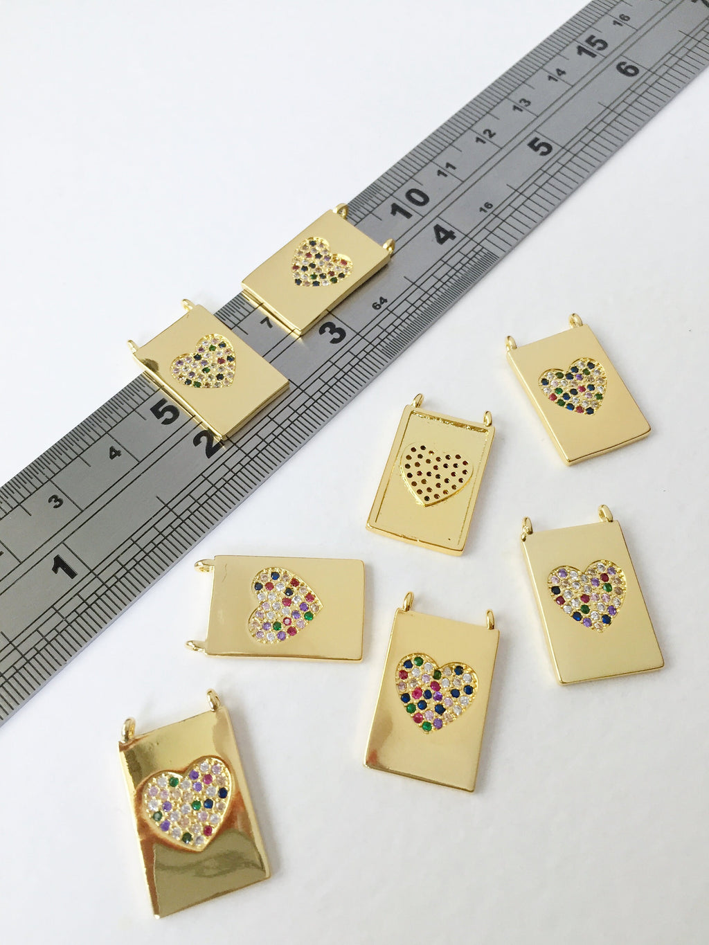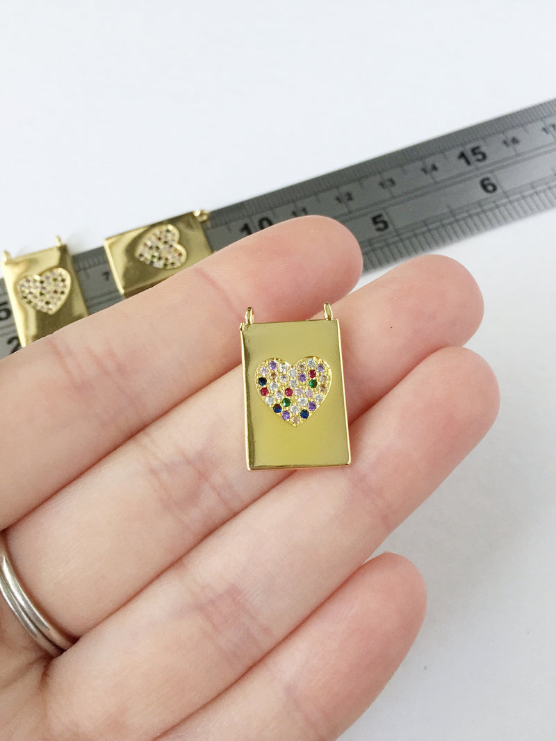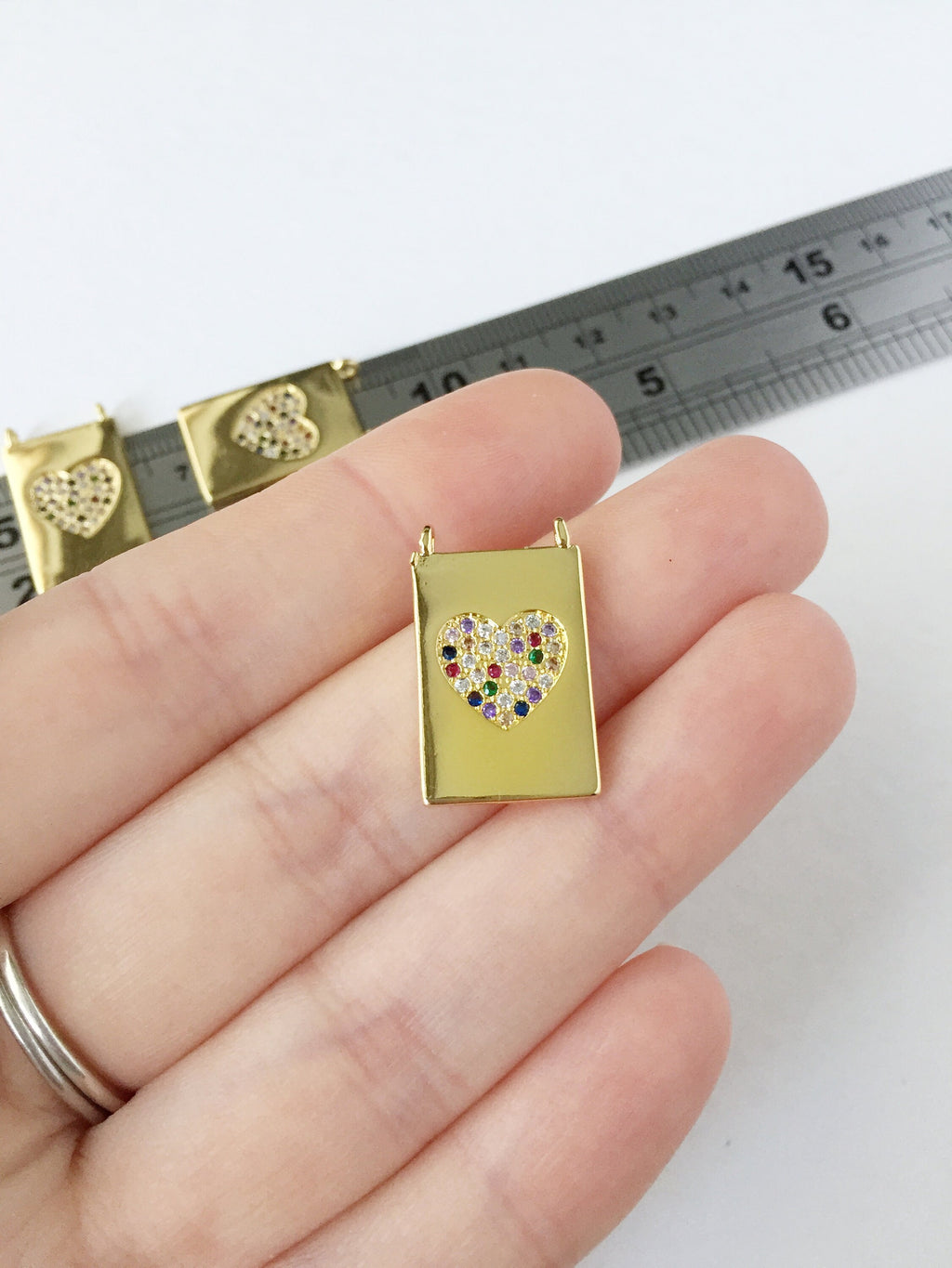 1 x 18K Gold Plated Rectangular Pendant with Multicolour CZ Paved Heart, 22.5x13.5mm (0218)