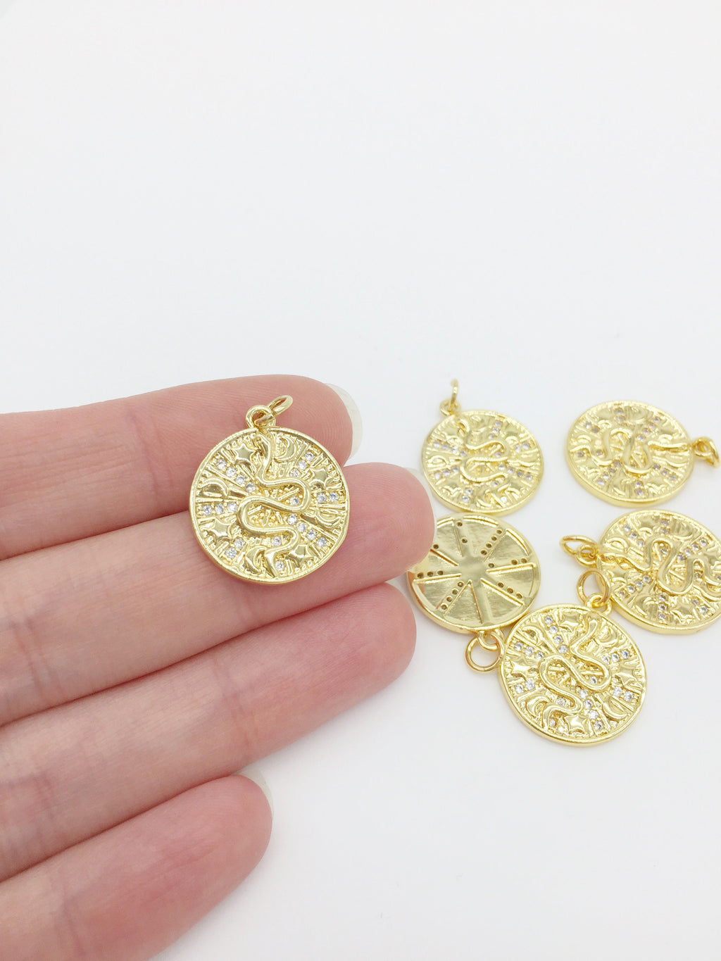 1 x 18K Gold Plated Snake Coin Pendant with Cubic Zirconia, 21x18mm (2730)