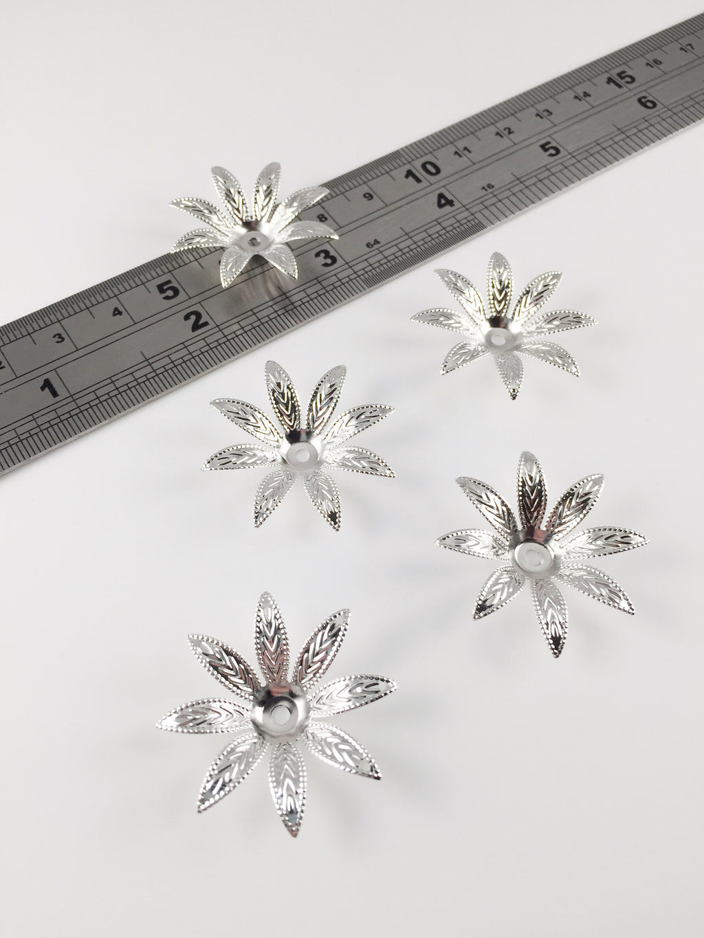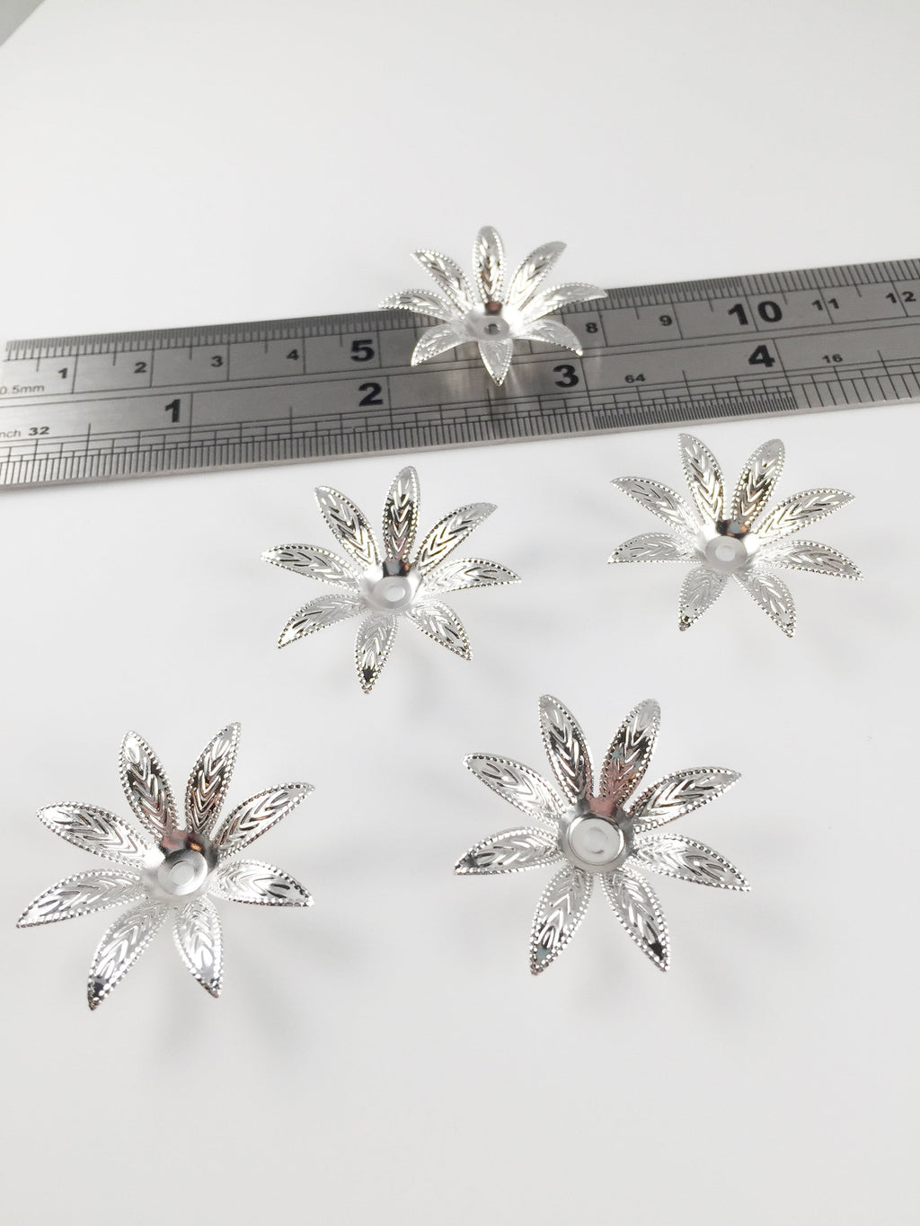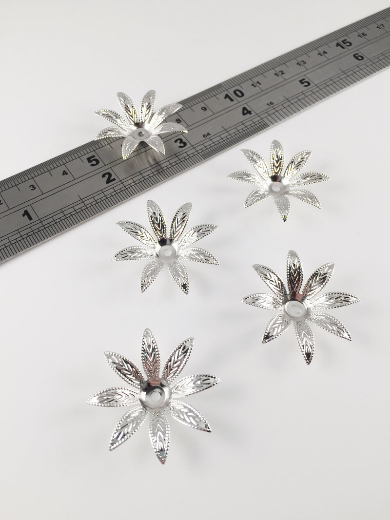 4 x Silver Flower Beads with Embossed Pointed Petals, 30mm